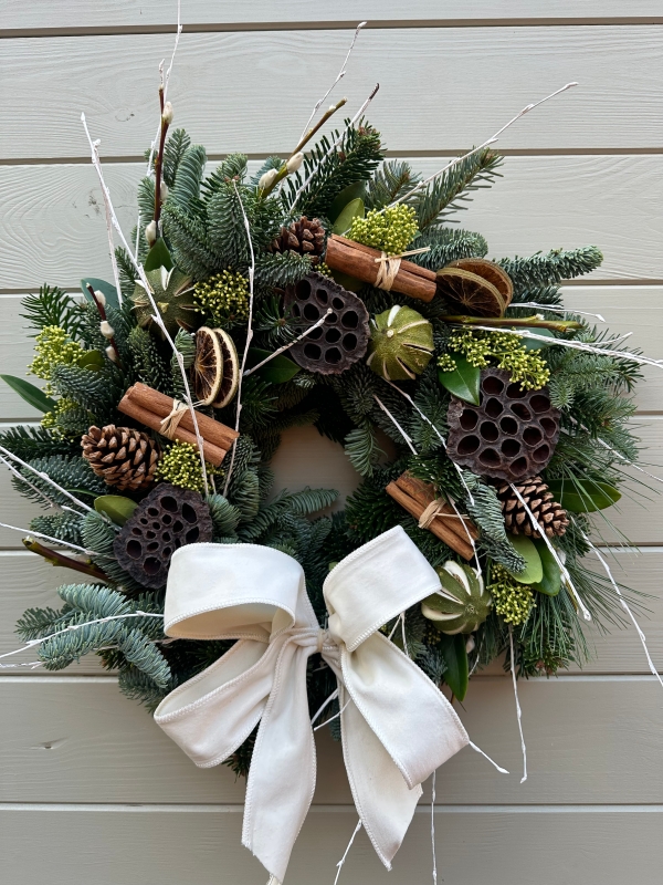 Fresh greens with whites are the theme for this door wreath which is handmade to order. We use a beautiful selection of fresh and dried materials with a ivory velvet bow. Foliage mix may differ slightly due to stock supplies.