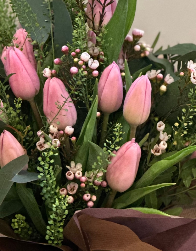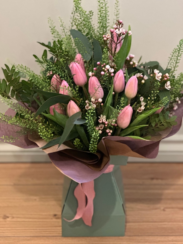 2 dozen pastel British tulips, beautifully arranged with wax flower and foliage. The bouquet is presented in a water filled gift box with co-ordinating paper and ribbon, complete with your message hand-written on a card.
