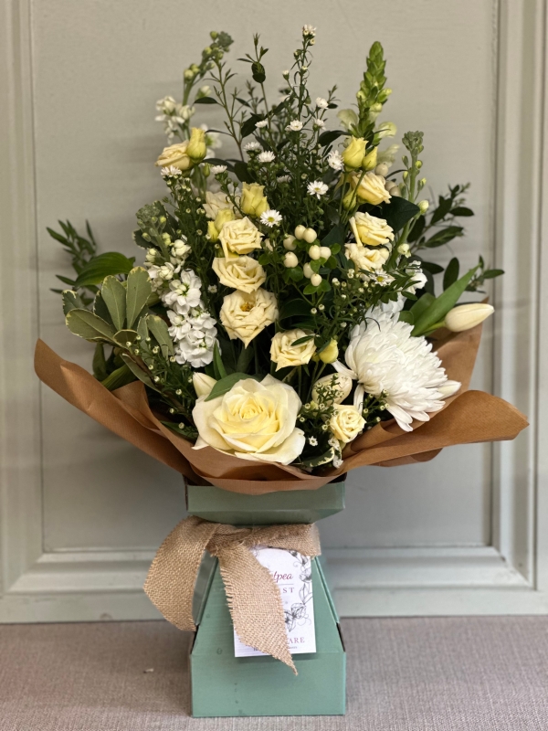 An elegant blend of classic white, creams and green flowers, beautifully arranged and hand tied, placed in water and presented in a gift box with co-ordinating ribbon, complete with your message hand-written on a card.