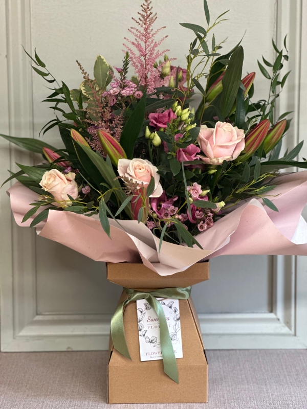 Long stemmed pink lilies and roses hand tied with luxurious foliage and other flowers to complement, placed in water and presented in a gift box with co-ordinating ribbon, complete with your message hand-written on a card.